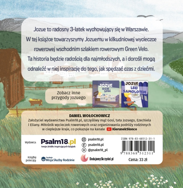 W tej książce towarzyszymy Jozuemu w kilkudniowej wycieczce rowerowej wschodnim szlakiem rowerowym Green Velo. Ta historia będzie radością dla najmłodszych, a i dorośli mogą odnaleźć w niej inspirację do tego, jak spędzać czas z dziećmi.